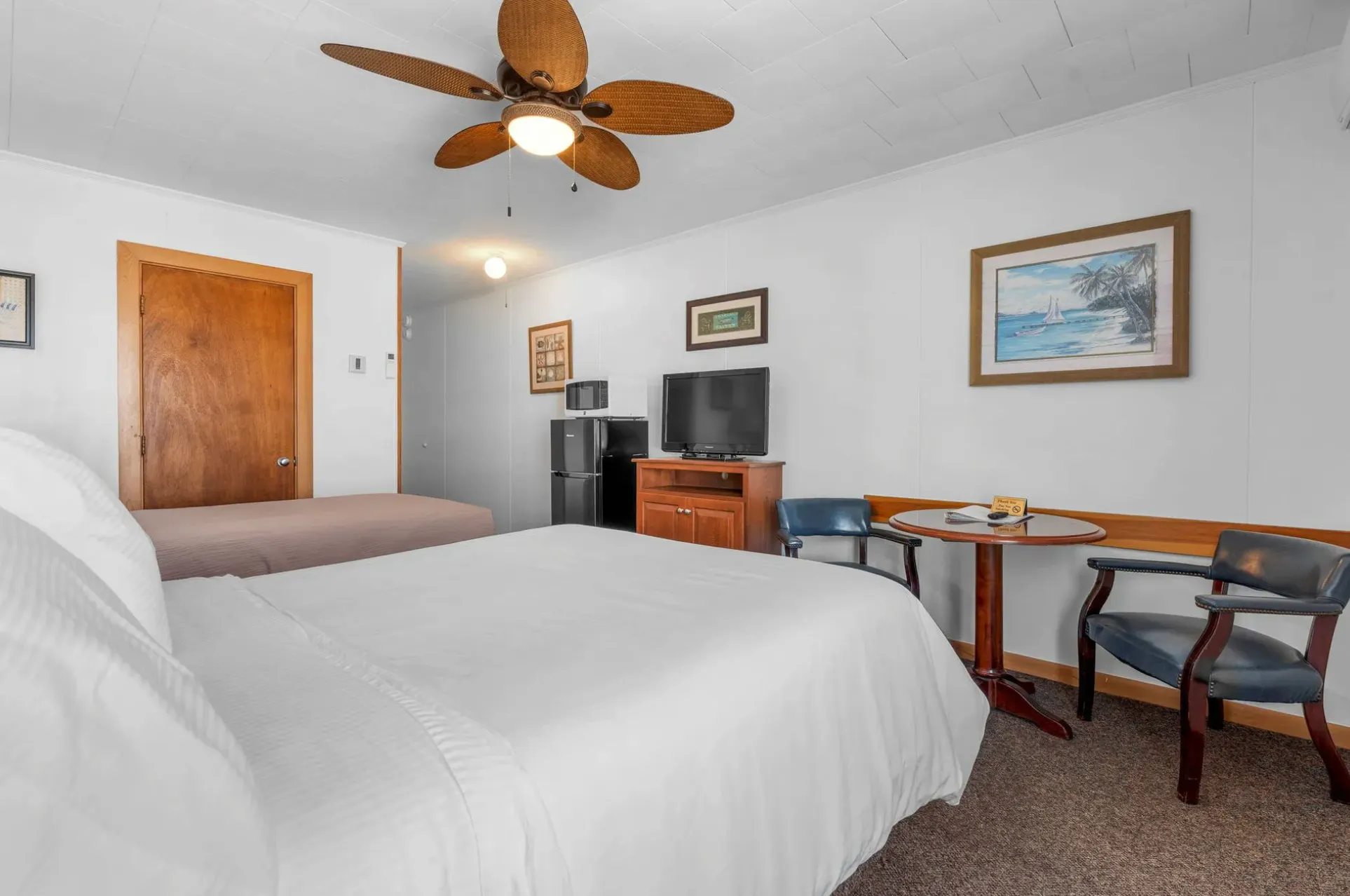 This standard style hotel room has one full sized bed and one twin bed, for sleeping of up to 3 people. Amenities include a microwave and mini fridge.