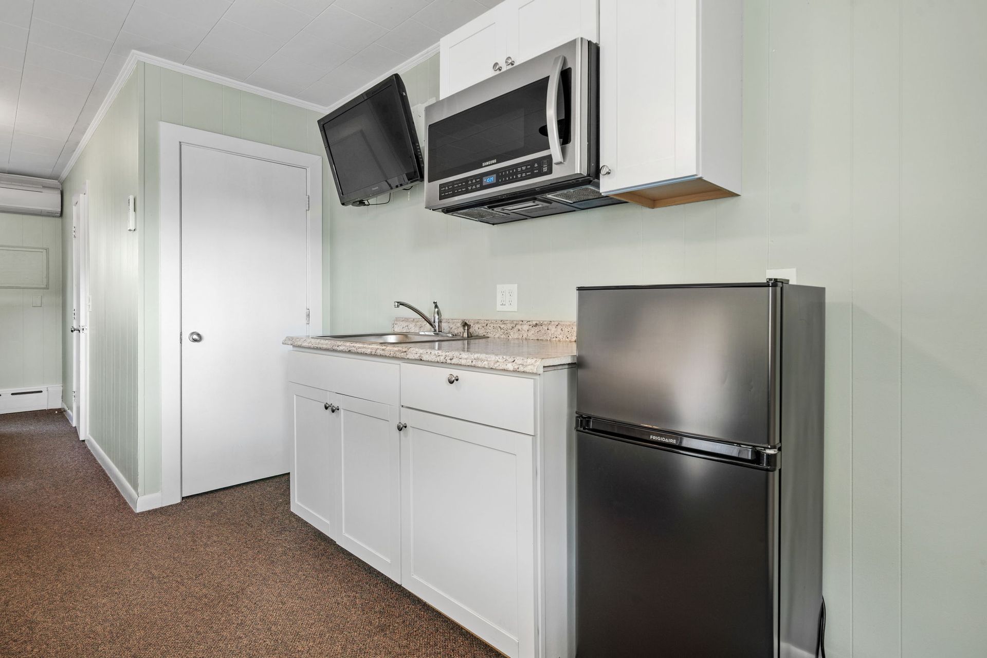 Perfect room for a family offering one queen bed and two twin beds. Partitions between the queen and twins, offering a bit of privacy. Kitchenette offerings include a 2 burner stove, refrigerator, microwave, drip coffee maker, toaster, pots, pans, plates, cups, etc. These rooms are located on the "Pool Side" of the hotel and offer small seating areas outside of each room. One assigned parking space provided.