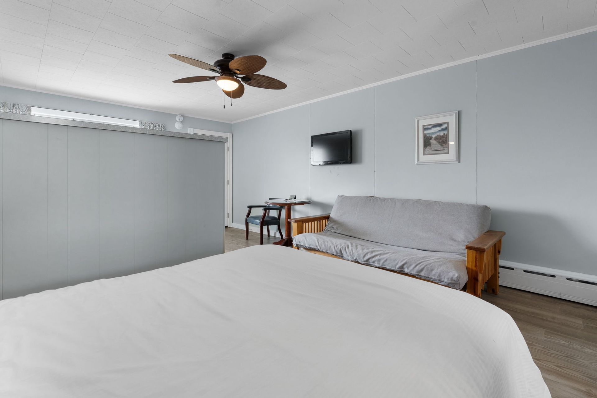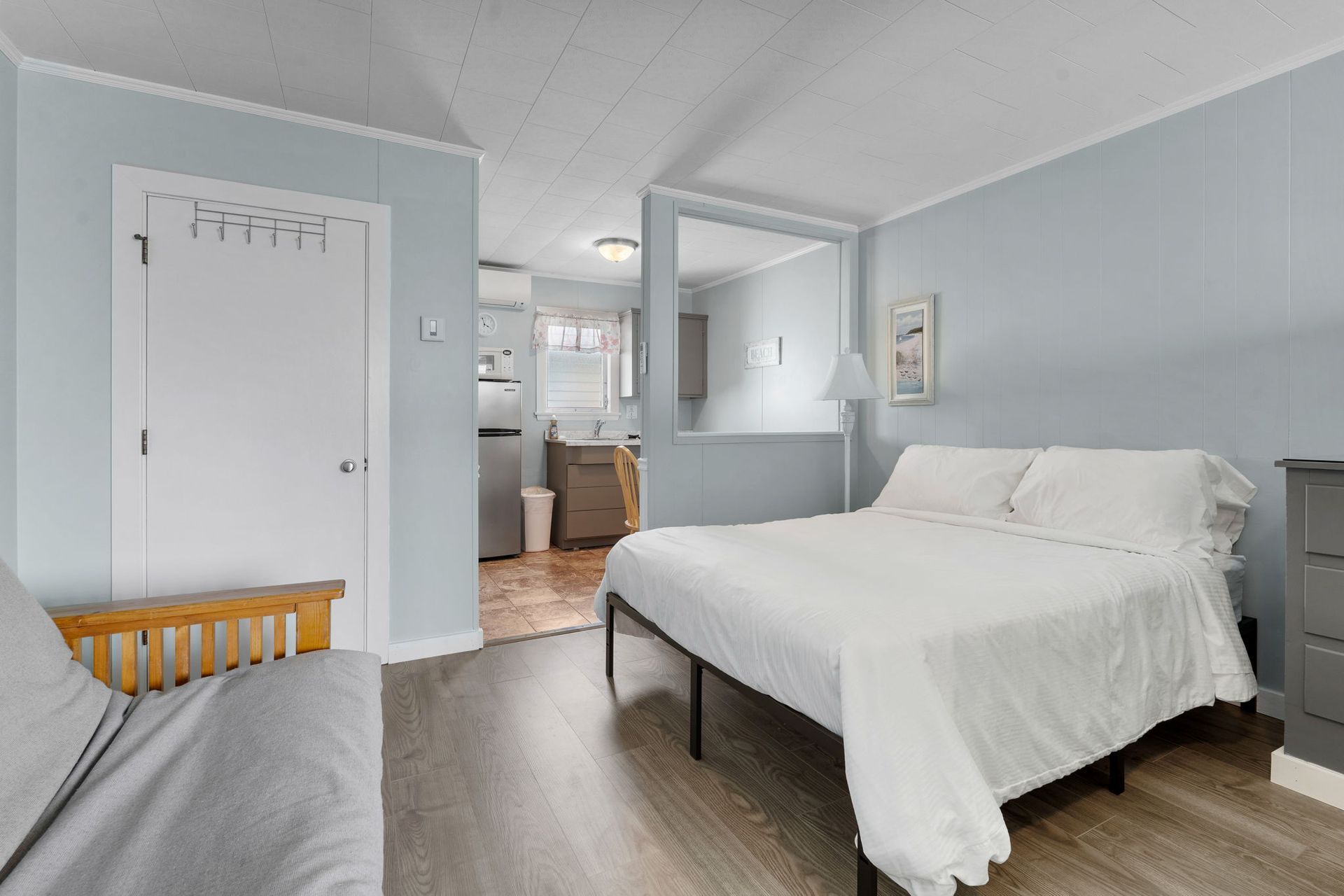 These rooms feature two queen beds and a futon and can accommodate up to six (6) people. There is a partition between the queen beds. Kitchenette offerings include a 2 burner stove, refrigerator, microwave, drip coffee maker, toaster, pots, pans, plates, cups, etc. These rooms are located in the wing above the office and offer small seating areas outside of each room. One assigned parking space provided.