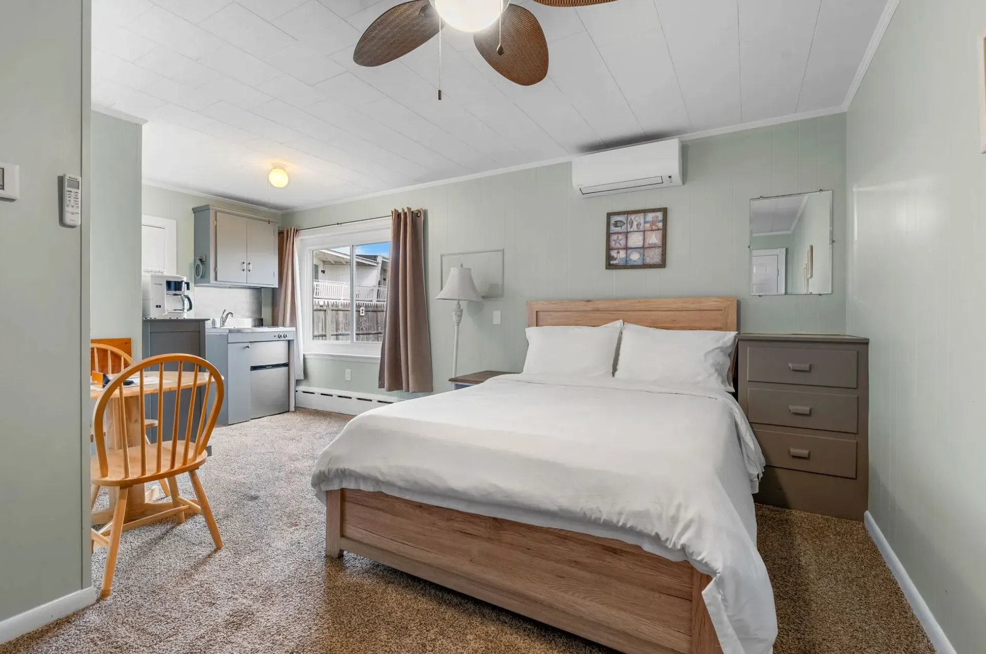 Great room for 1-2 people, with a single queen bed. Kitchenette offerings include a 2 burner stove, refrigerator, microwave, drip coffee maker, toaster, pots, pans, plates, cups, etc. This room is located on the first floor in the corner of the building, with access to the common area outdoor seating. One assigned parking space provided.