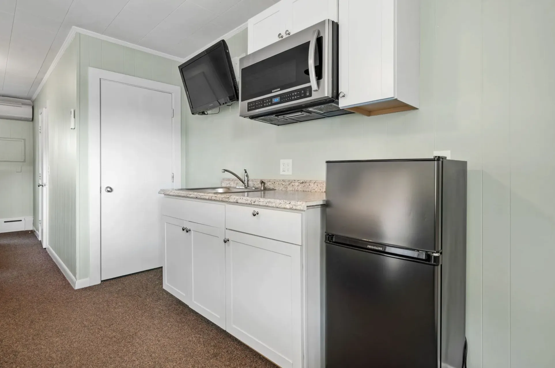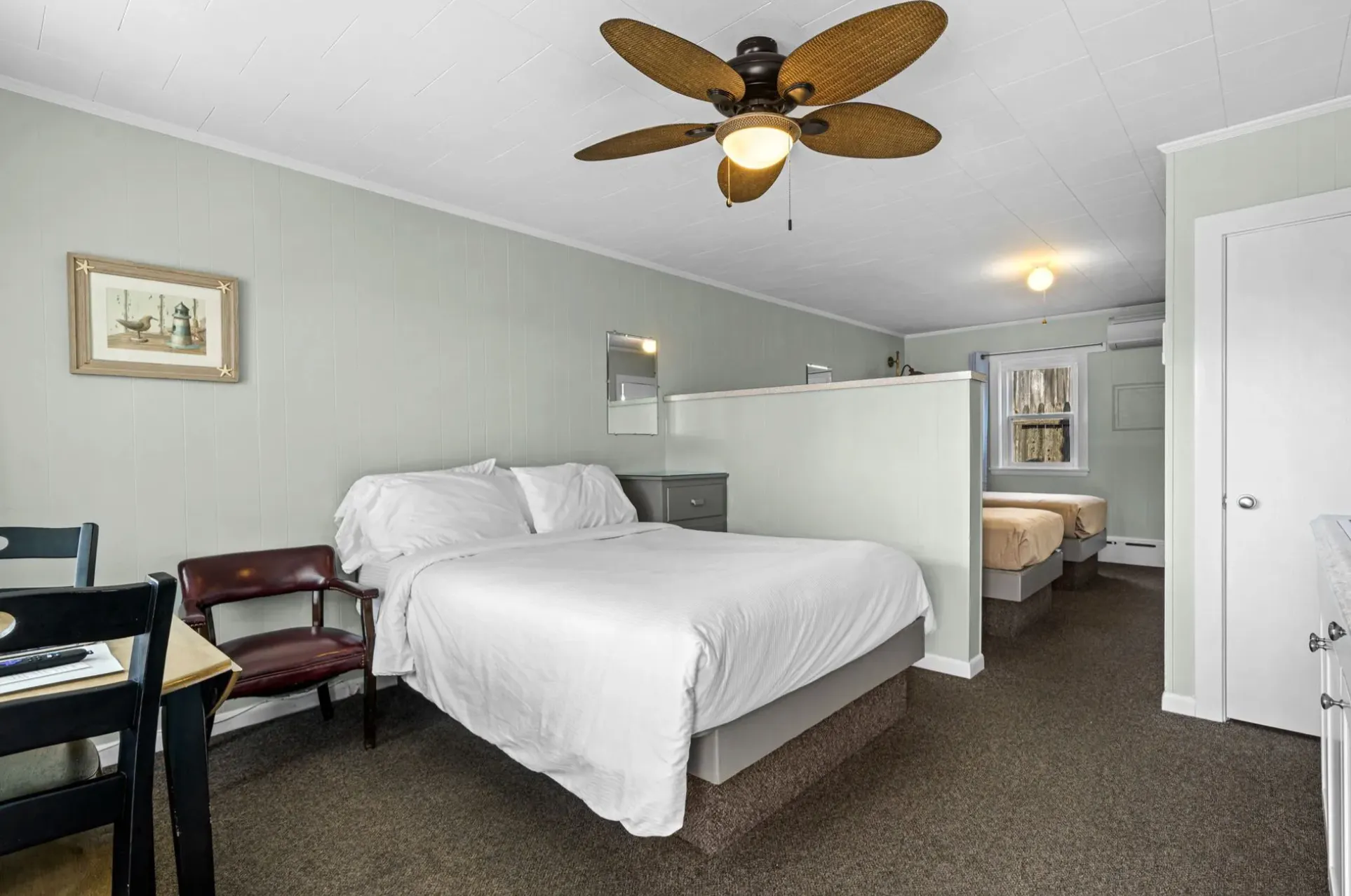 Perfect room for a family offering one queen bed and two twin beds. Partitions between the queen and twins, offering a bit of privacy. Kitchenette offerings include a 2 burner stove, refrigerator, microwave, drip coffee maker, toaster, pots, pans, plates, cups, etc. These rooms are located on the "Pool Side" of the hotel and offer small seating areas outside of each room. One assigned parking space provided.